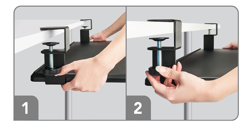 ▼安裝在桌面上也很簡單,把C型夾靠到最底,再將兩個旋鈕轉緊,然後就這樣!不用懷疑,輕鬆兩步驟鍵盤架DIY安裝完成,這款鍵盤架免鑽洞不用破壞桌板,真的很方便。